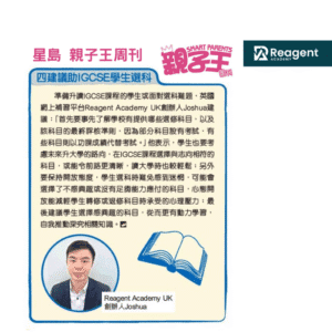 準備升讀IGCSE課程的學生或面對選科難題,英國網上補習平台Reagent Academy UK創辦人Joshua建議:「首先要事先了解學校有提供哪些選修科目,以及該科目的最終評核準則,因為部分科目設有考試,有些科目則以功課成績代替考試。」他表示,學生也要考慮未來升大學的路向,在IGCSE課程選擇與志向相符的科目,或能令前路更清晰,讀大學時也較輕鬆;另外要保持開放態度,學生選科時難免感到迷惘,可能會選擇了不感興趣或沒有足夠能力應付的科目,心態開放能減輕學生轉修或退修科目時承受的心理壓力;最後建議學生選擇感興趣的科目,從而更有動力學習,自我推動深究相關知識。